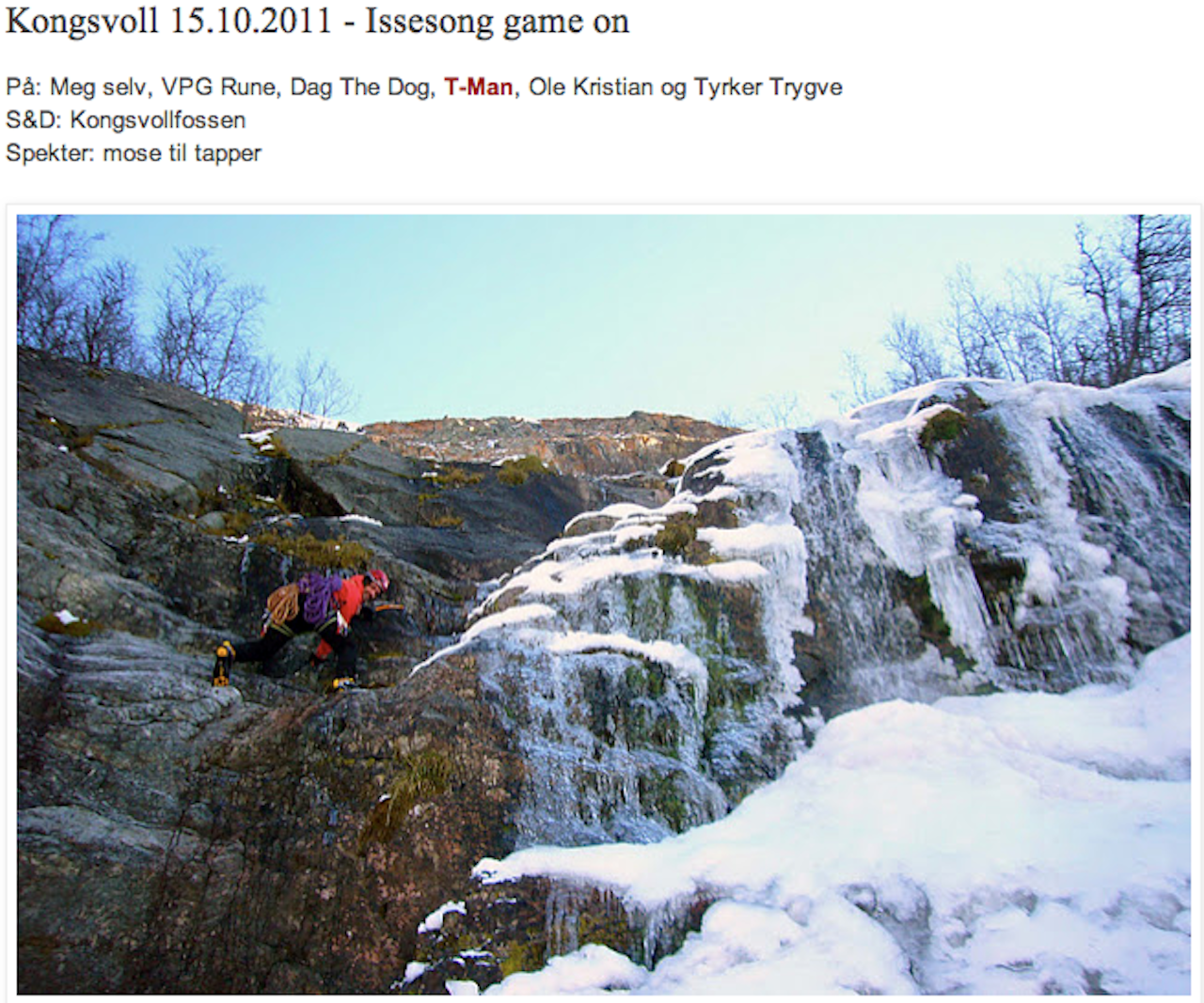 Gutta bak den morsomme bloggen Olsendriver, brødrene Grimsæth og Marius «Varri» Olsen (det er vel strengt tatt Marius Grimsæth som står bak loggføringen på nettet), har vært på årets første istur, noe som selvsagt gjenspeiles i bloggen. Både bildene og headingen «mose til tapper» tyder på at det fremdeles er tidlig, men fine fotos fra Kongsvollfossen nå i helgen lover godt for en lang vintersesong.
