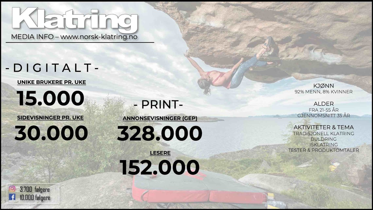 Samtidig er satsingen digitalt styrket og økt produksjonen av innhold på nett. I en tid da verden endres fra dag til dag, er nettsidene en svært god kanal for å gi leserne oppdatert innhold. Økt verdi for brukerne våre betyr også at annonseproduktet digitalt øker i verdi. Vi vil fortsatt begeistre våre lesere innenfor de ulike aktivitetene gjennom våre fem nettsteder og på norsk-klatring.no vil man få mer og bedre innhold enn noen gang.
