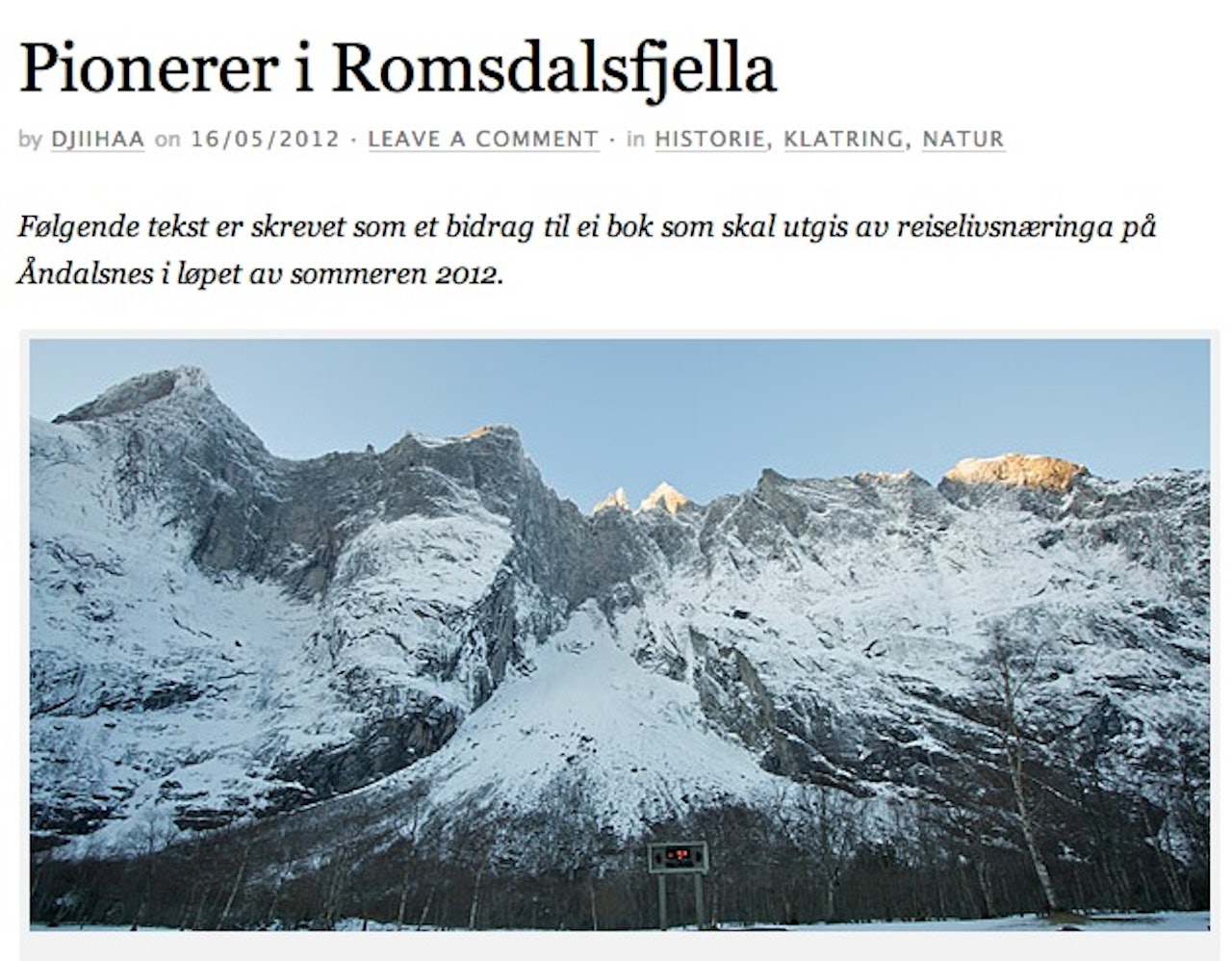 I mai la han ut et lengre innlegg om Romsdalens klatrehistorie som burde interessere lesere av denne siden. Artikkelen er skrevet til en bok som utgis denne sommeren, men vi får altså en sniktitt på bloggen til Svanemyr – i passende tid til høysesongen i de romsdalske fjell.