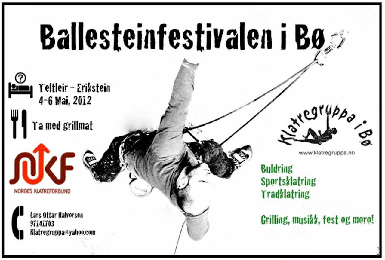 Helgen den 4.-6. mai blir det samling på buldrefeltet Erikstein i Bø i Telemark – et område som i tillegg til masse førsteklasses buldring også byr på klippeklatring av høy kvalitet. Arrangøren, Klatregruppa i Bø lover grilling, musikk og annen moro, så hold av første maihelgen for Ballesteinsfestivalen og en tur til Telemarks varierte klatremuligheter.