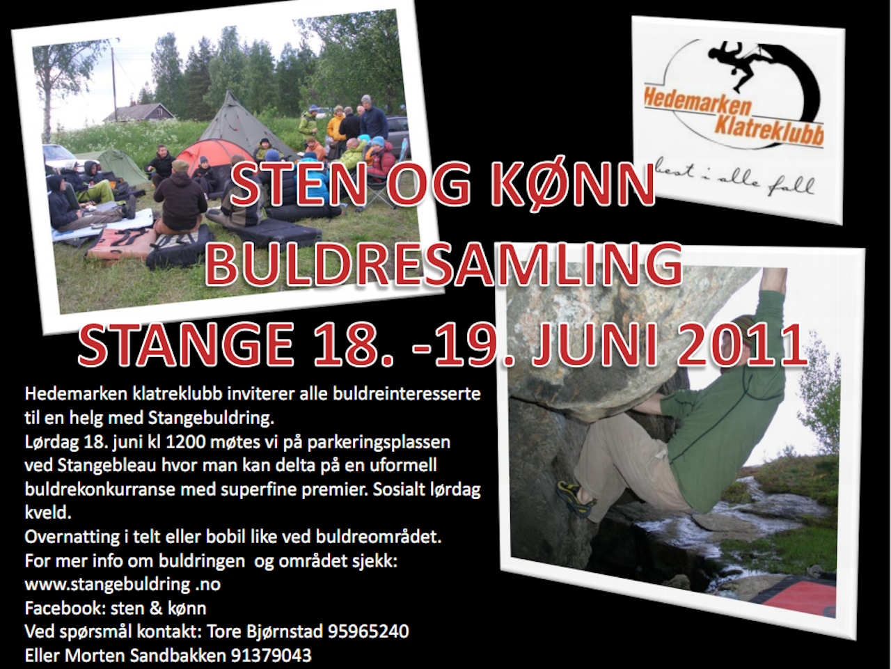 Se nettsiden stangebuldring.no for mer info om buldringen på Stange. Se Facebook: sten & kønn for mer info om samlingen på nettet.
