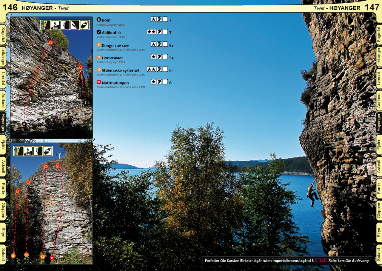 Sogndal Klatreklubb og forfatterne Robert Tellvik og Ole Karsten Birkeland har gjort en stor jobb med å lage en moderne fører, hvor alle klippene har bildefører slik at du enkelt finner frem.