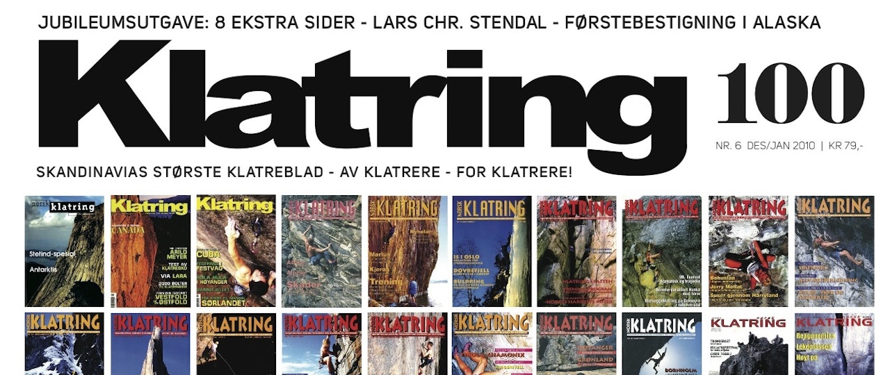 Er det en utgave av Klatring du virkelig må gå til anskaffelse av, er det nr 100. Vi har økt med åtte sider for å få plass til alt som skulle inn. Rosinen i pølsa er den komplette historien om bladet, og intervju med mannen som fikk ideen og frambragte de første utgavene.