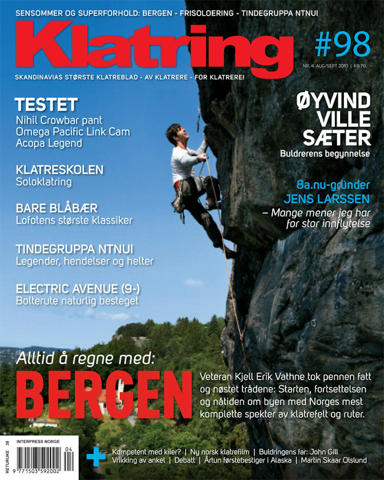 Mer: Leserinnlegg, Bjørn-Eivind Årtun med ny rute i Alaska, klassikern fra Lofoten, stasj, sikre sider, Klatreforbundet, historikk om John Gill – i Klatring 98 vil du få tilfredsstilt de fleste visuelle og gir det beste av klatrerelatert lesestoff.