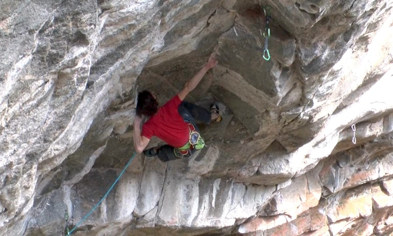 Hardt arbeid. Ondra har borret ferdig superlinja i Hanshelleren, og er nå igang med å jobbe inn flytt og sekvenser på den 55 meter lange og bratt-bratte ruta som vel kan ende opp som verdens hardeste. Foto: Olav Strøm