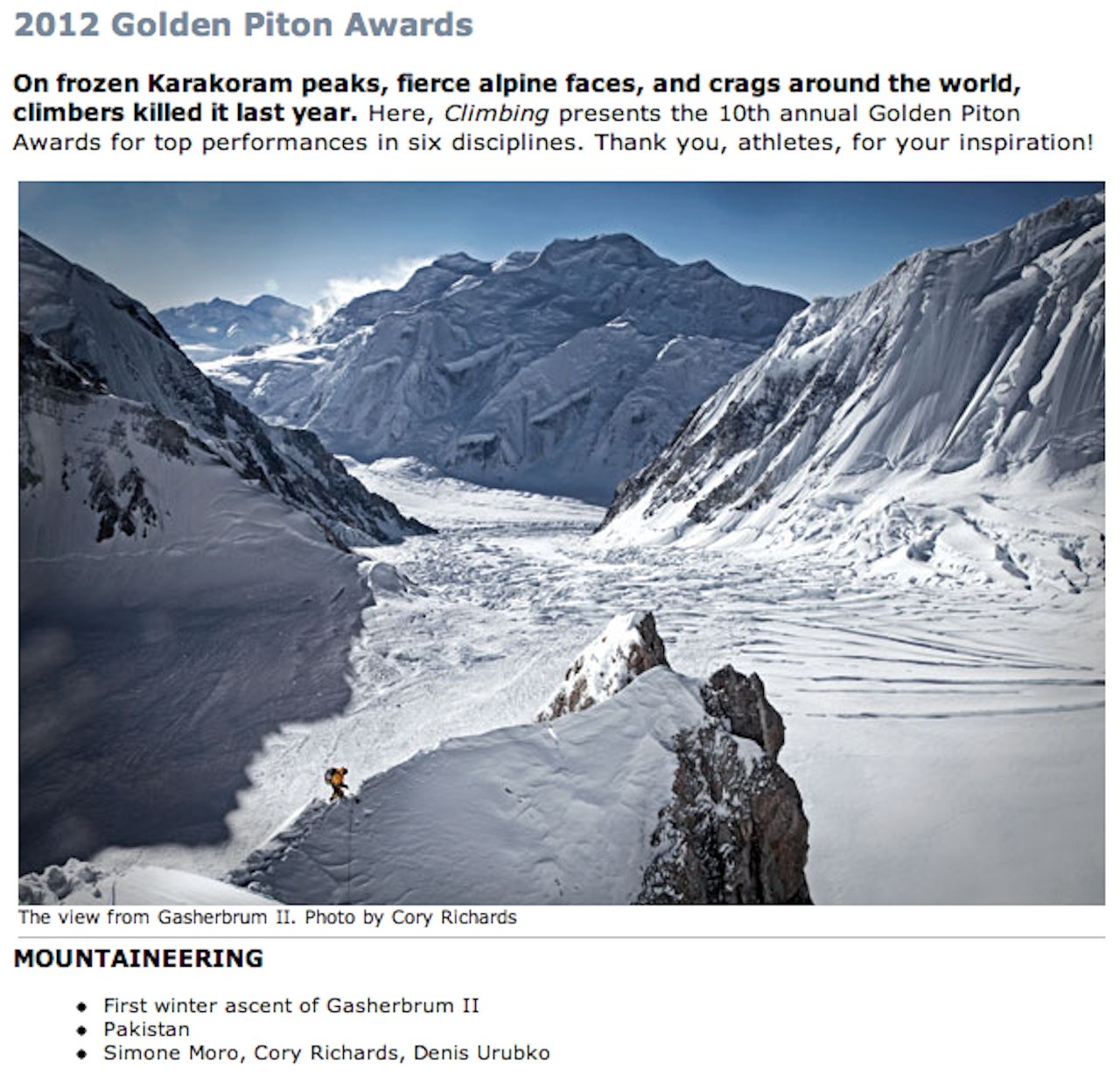For tiende gang hedrer det amerikanske tidsskriftet Climbing det ypperste av klatreprestasjoner over siste år, med sin egen Golden Piton Award. Utmerkelsene dekker det vide spekteret av klatring, fra høyfjellsalpinisme til den skarpeste sportsklatringen; i alt seks disipliner, valgt ut av redaktørene i Climbing med utgangspunkt i spalten «Hot Flashes» fra fjoråret. Flere av disse bragdene er også dekket tidligere her på siden.