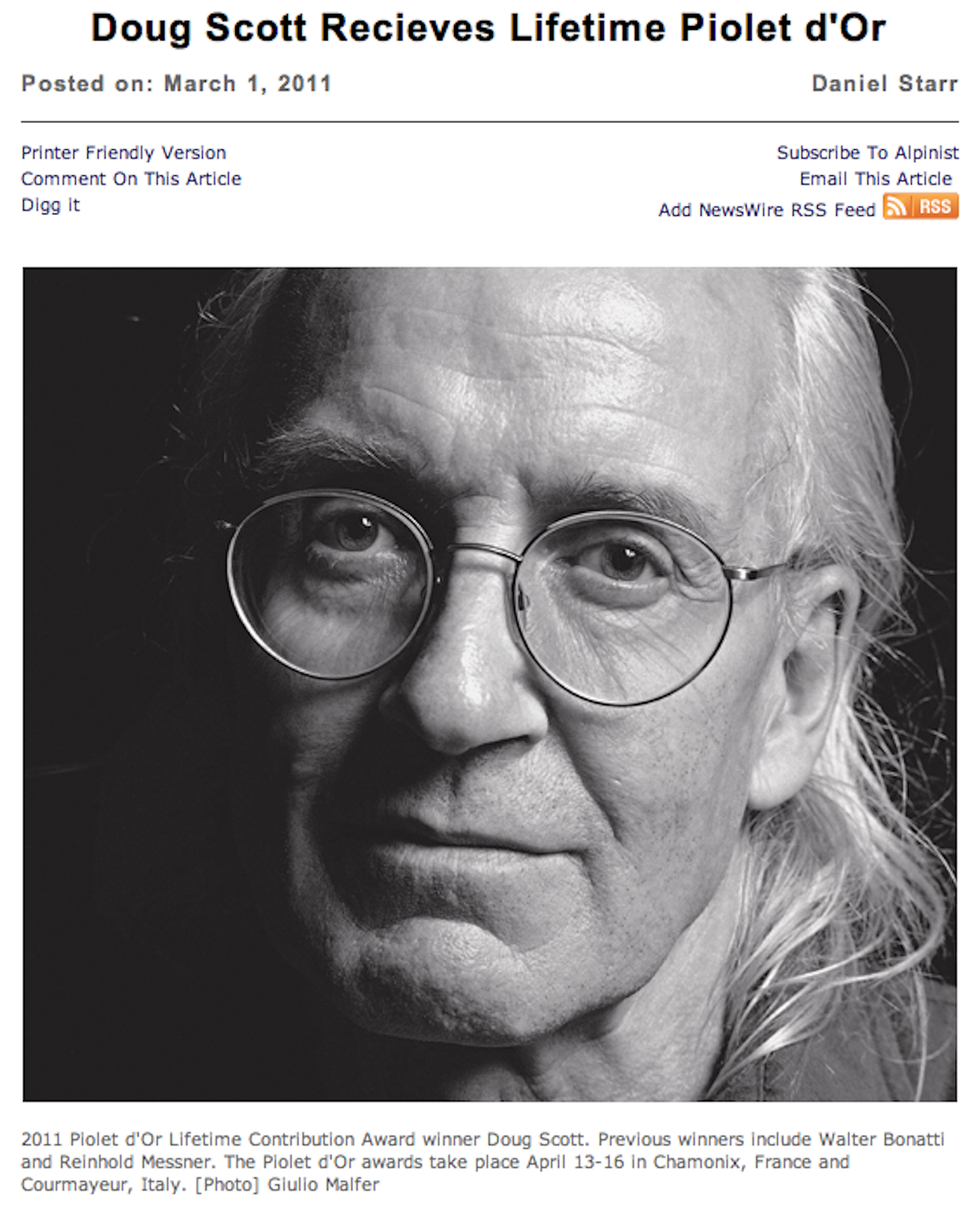 Årets «Gyldne isøks for lang og tro tjeneste» tildeles Doug Scott for sine bidrag til klatringen gjennom et helt liv. Scott er dermed den tredje mottaker av prisen, siden man i 2009 valgte å opprette en egen kategori av den kjente alpinprisen, tilegnet livslang innsats i det vertikale element. Tidligere mottakere er Walter Bonatti (2009) og Reinhold Messner (2010), så Scott er i svært celebert selskap.