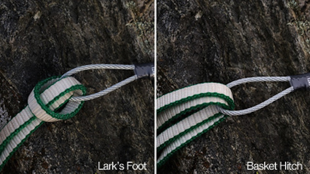 Løsningen er altså å feste en slynge direkte i kilewiren. DMM har testet bruddstyrken på to ulike måter å gjøre dette på: med ankerstikk – girth hitch eller lark's foot-løkke – kontra å tre hele slyngen gjennom wireløkka på kilen og hekte begge endene inn på karabinen, slik at slynga blir liggende dobbelt gjennom wireløkken; en såkalt basket hitch på engelsk (se foto).